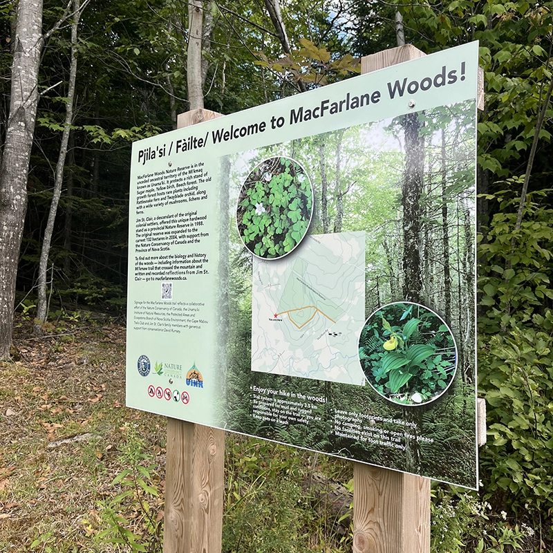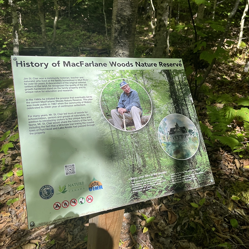 Tucked into the uplands west of Lake Ainslie, MacFarlane Woods stands as both a natural treasure and a living legacy. This old-growth hardwood forest was protected thanks to the lifelong efforts of Jim St. Clair—a teacher, historian, and naturalist who spent over 50 years living on his family’s homestead in Mull River. A descendant of the original settlers, Mr. St. Clair recognized the ecological and educational value of this land and began the work to preserve it back in the 1980s. Thanks to his efforts, the area became a nature reserve in 1988 and expanded to 132 hectares in the years that followed.